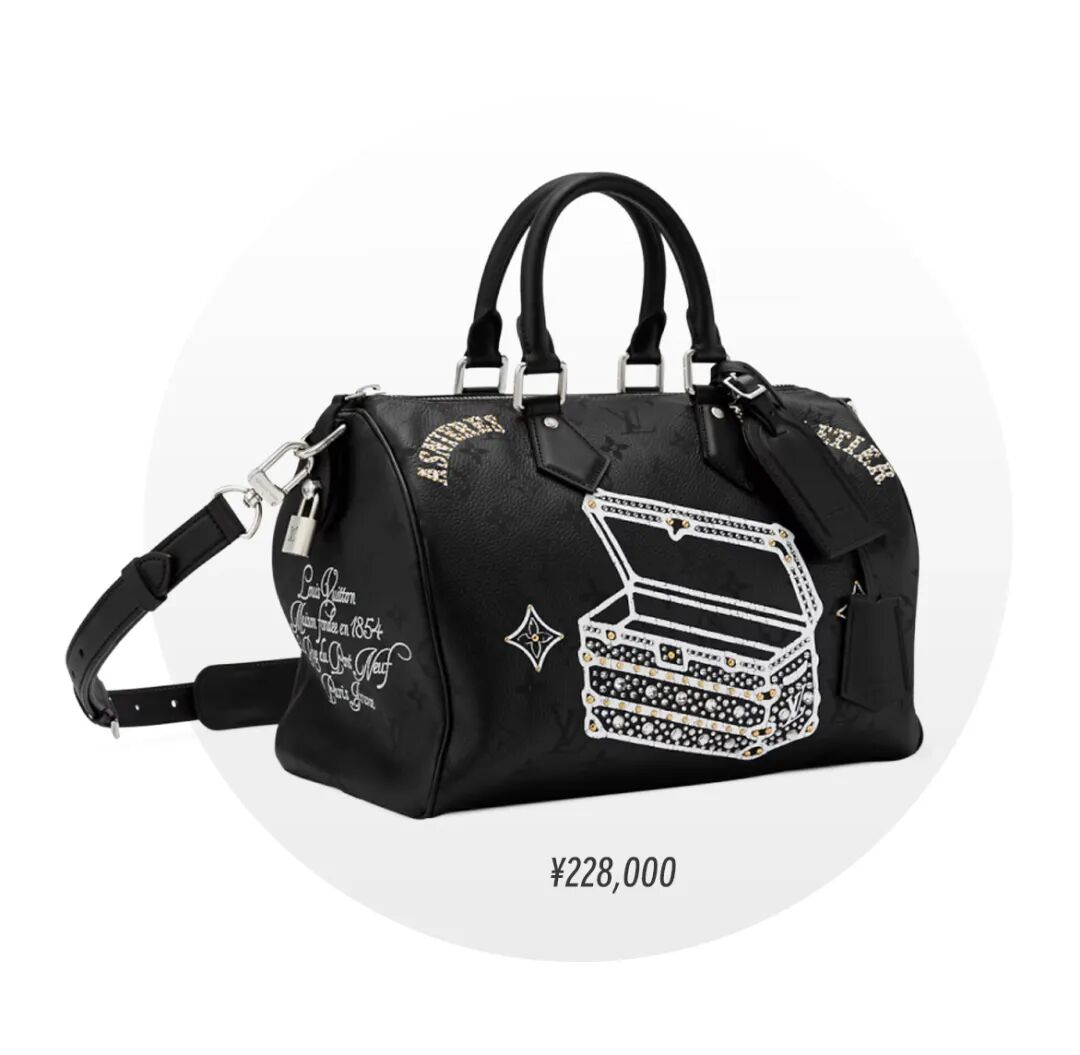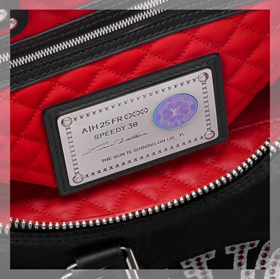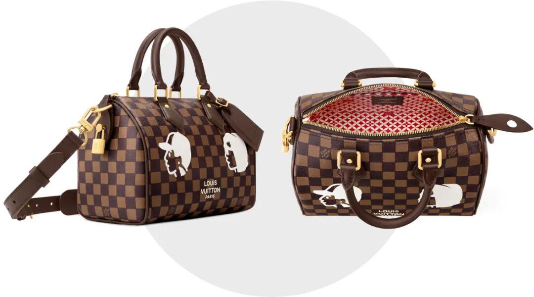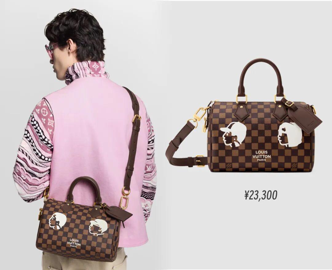 比方上面这只以棋盘格老花帆布为基地的Speedy 25,它的价格是23300元,大概比常规款贵了1万元。设计区别就在于包身图案以及独特内里,包面是Pharrell Williams与创意伙伴Nigo的双人肖像画,内衬是醒目的红色棉质品牌标识。总之所有元素都围绕着“你的Speedy,我的Speedy好像不一样”来的。