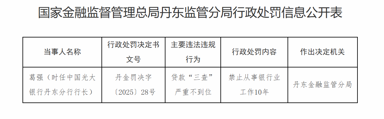 10月10日金元速配,国家金融监督管理总局丹东监管分局行政处罚信息公开表显示,葛某(时任中国光大银行丹东分行行长)因贷款“三查”严重不到位被禁止从事银行业工作10年。