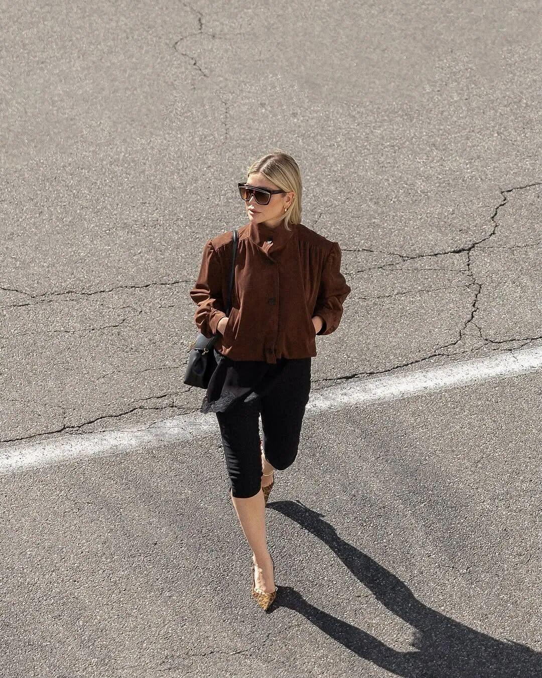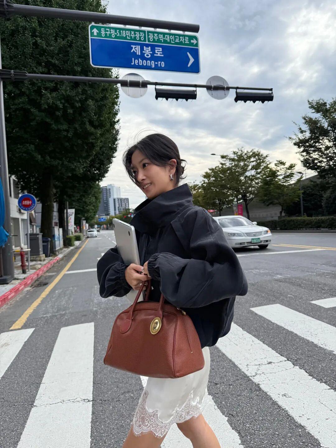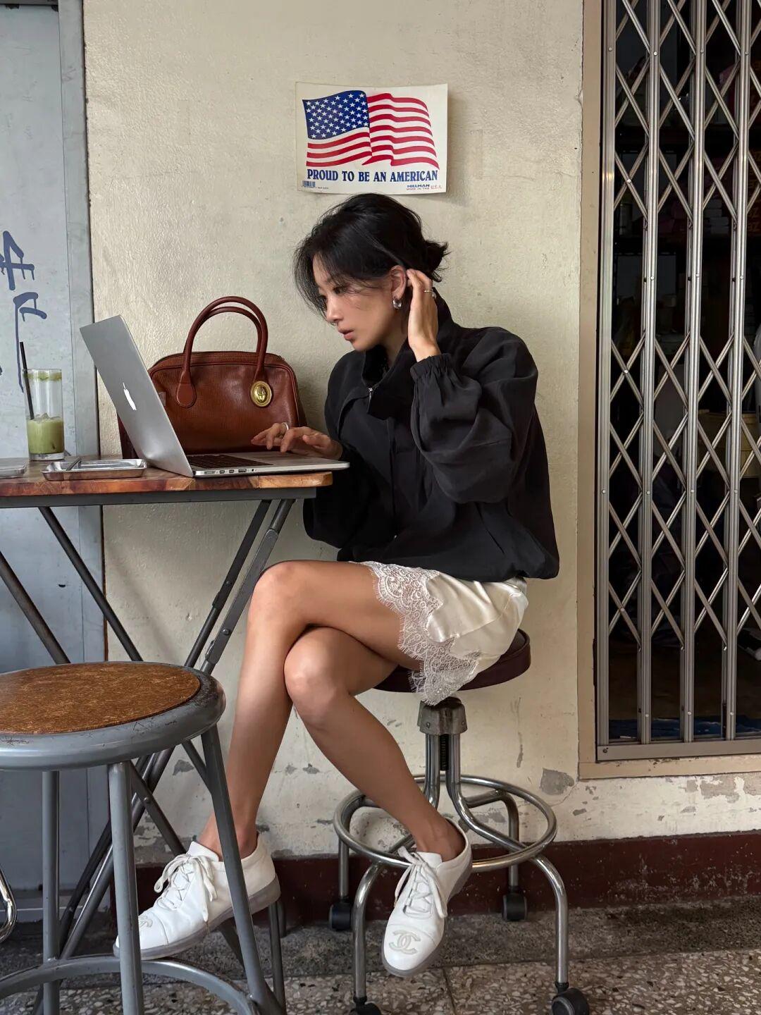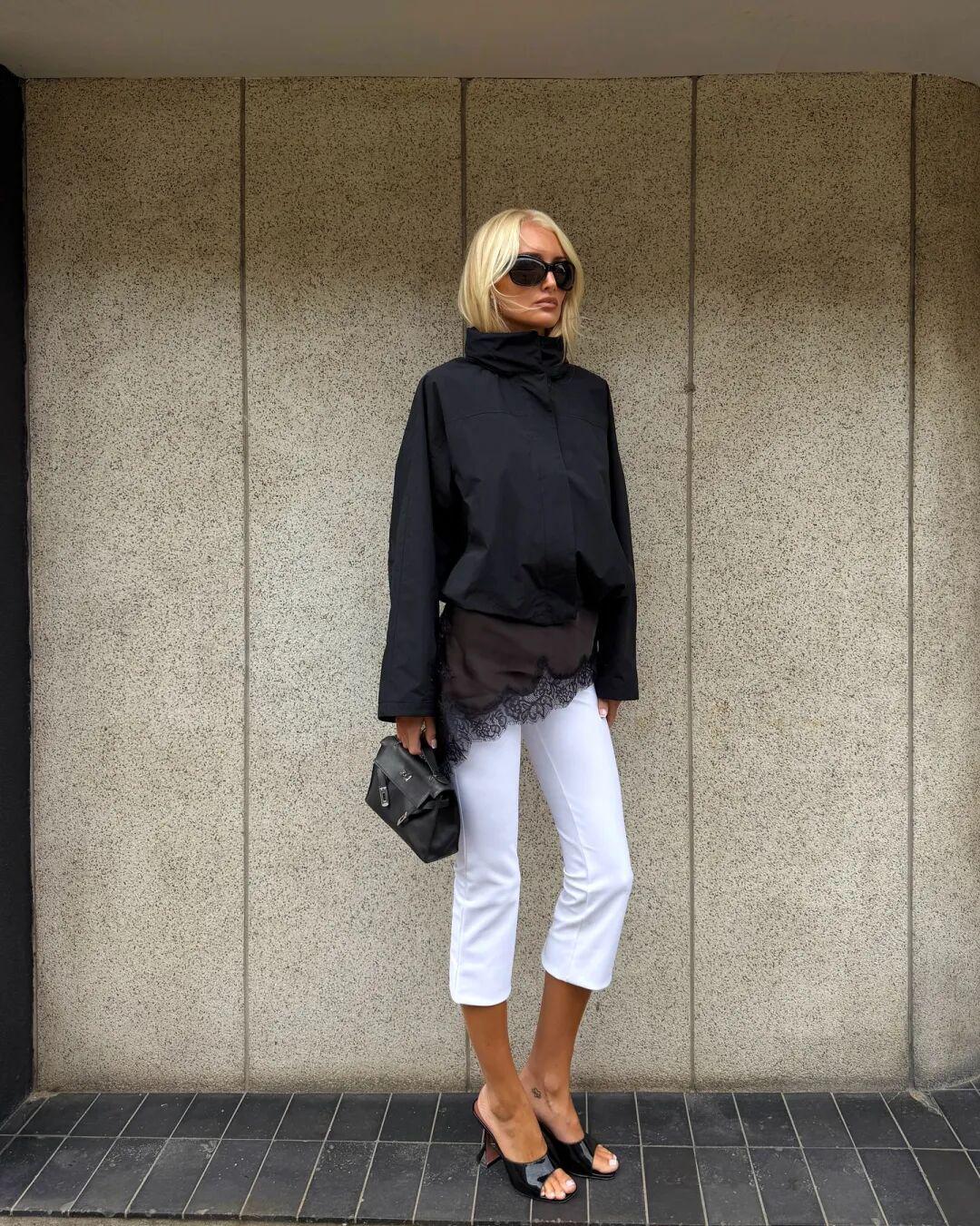 我还发现博主们还很喜欢在漏斗领夹克穿蕾丝上衣,露出一小截蕾丝下摆,搭七分裤穿,很有创意的穿法,但不太建议普通人尝试,视觉上容易分成四小截。▼