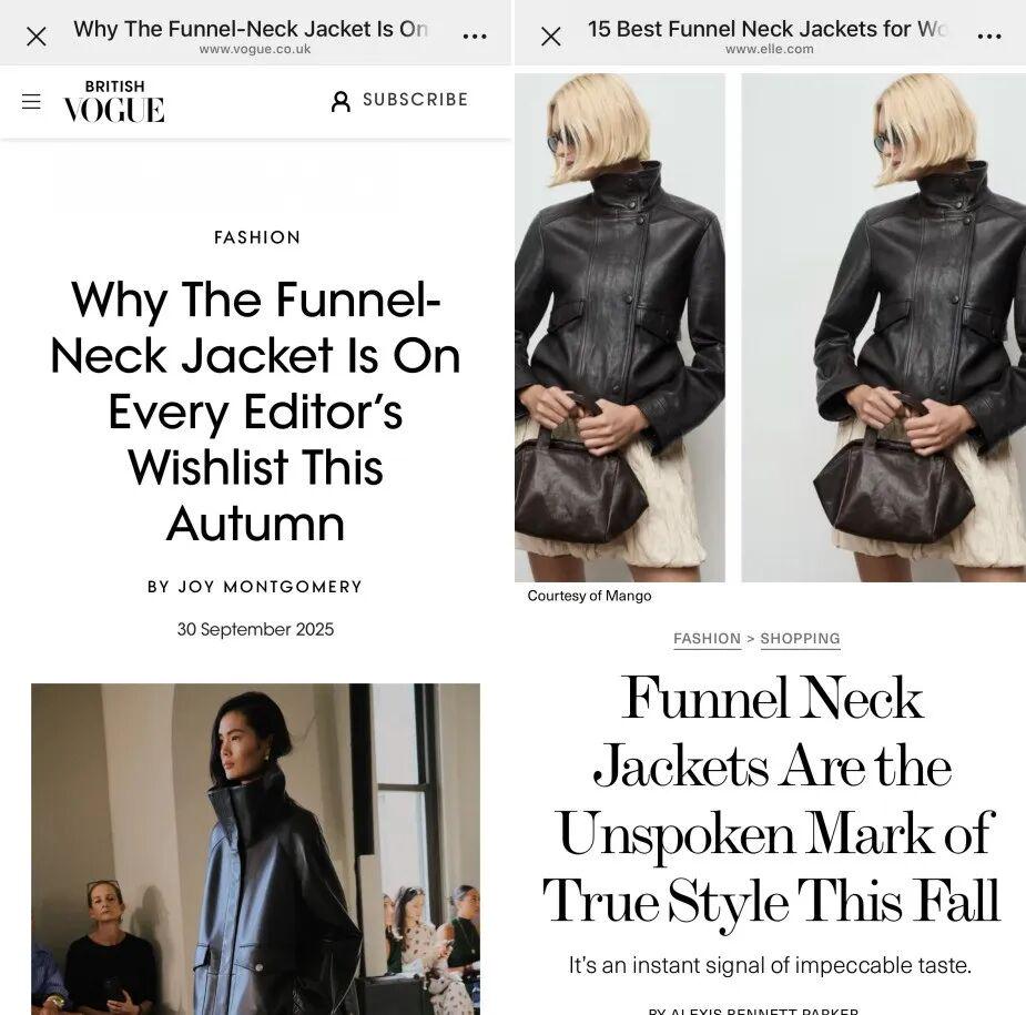 VogueElle等时尚网站前后陆续都写了这件漏斗领外套。 ▼