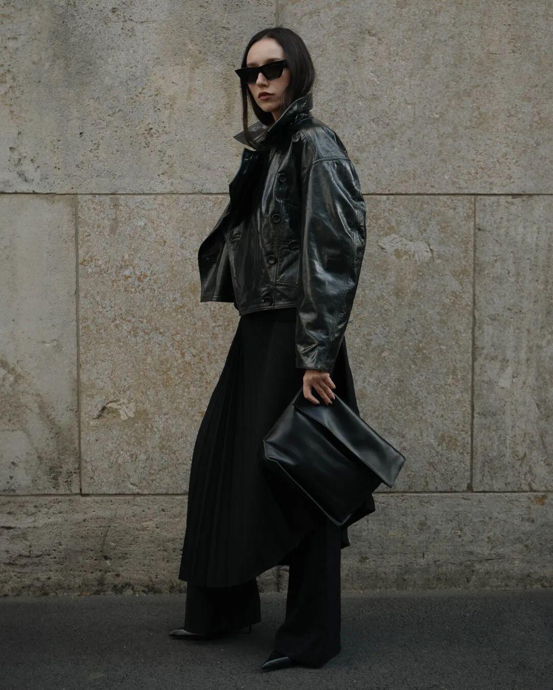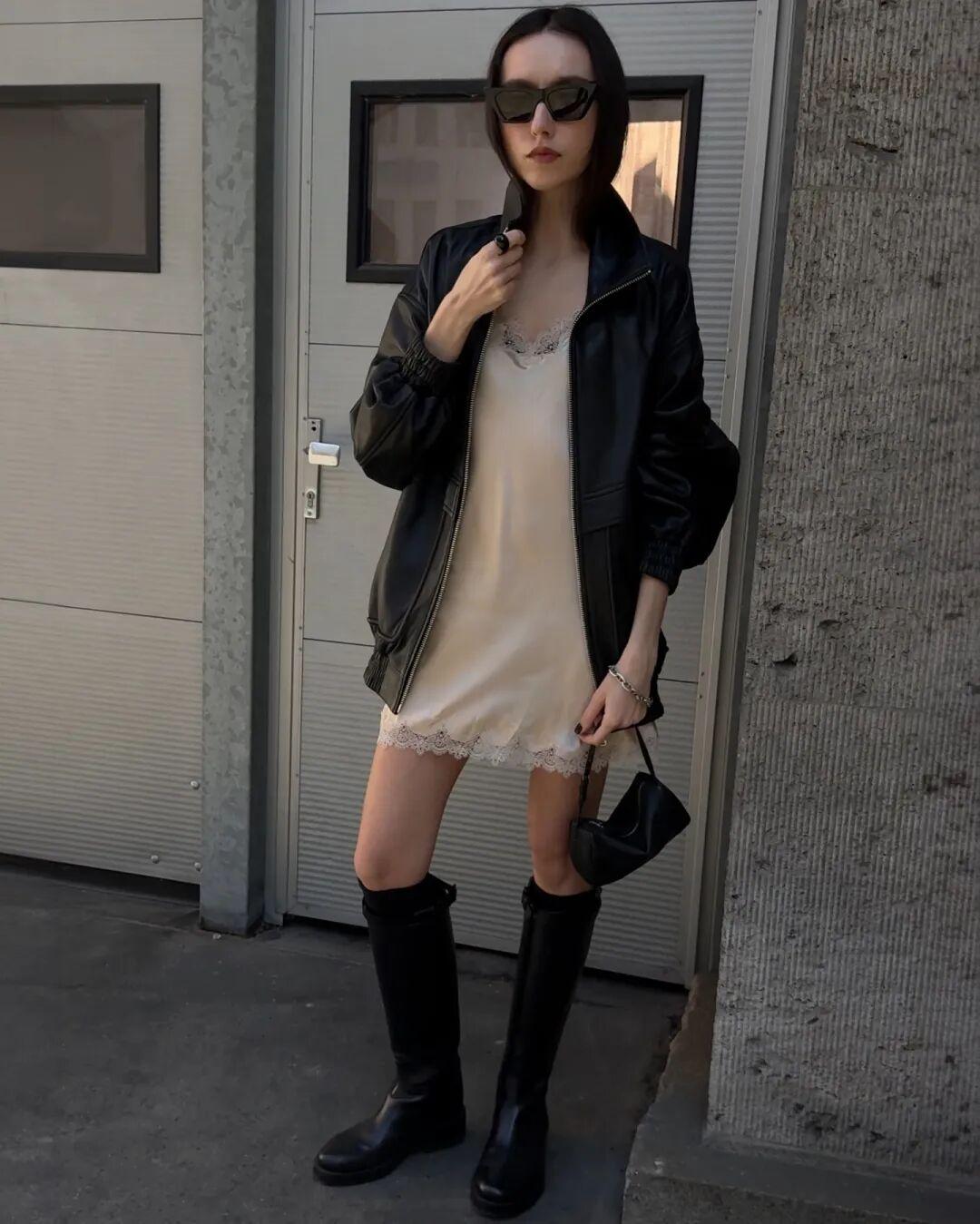 漏斗领会牺牲一点露肤度,可以选短款的皮衣,长度建议在臀上或者刚好过臀,更显利落。▼